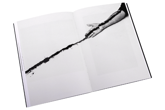 • Livro aberto com imagem em preto e branco de mão e linha escura