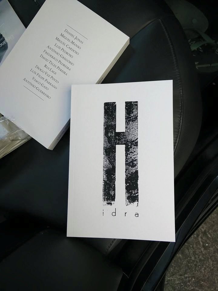 • Dois livros em capa branca com texto em preto, um com grande H e 'idra', outro aberto com lista de nomes