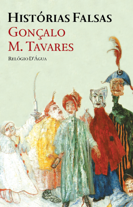 Capa do livro 'Histórias Falsas' com ilustração de figuras mascaradas coloridas