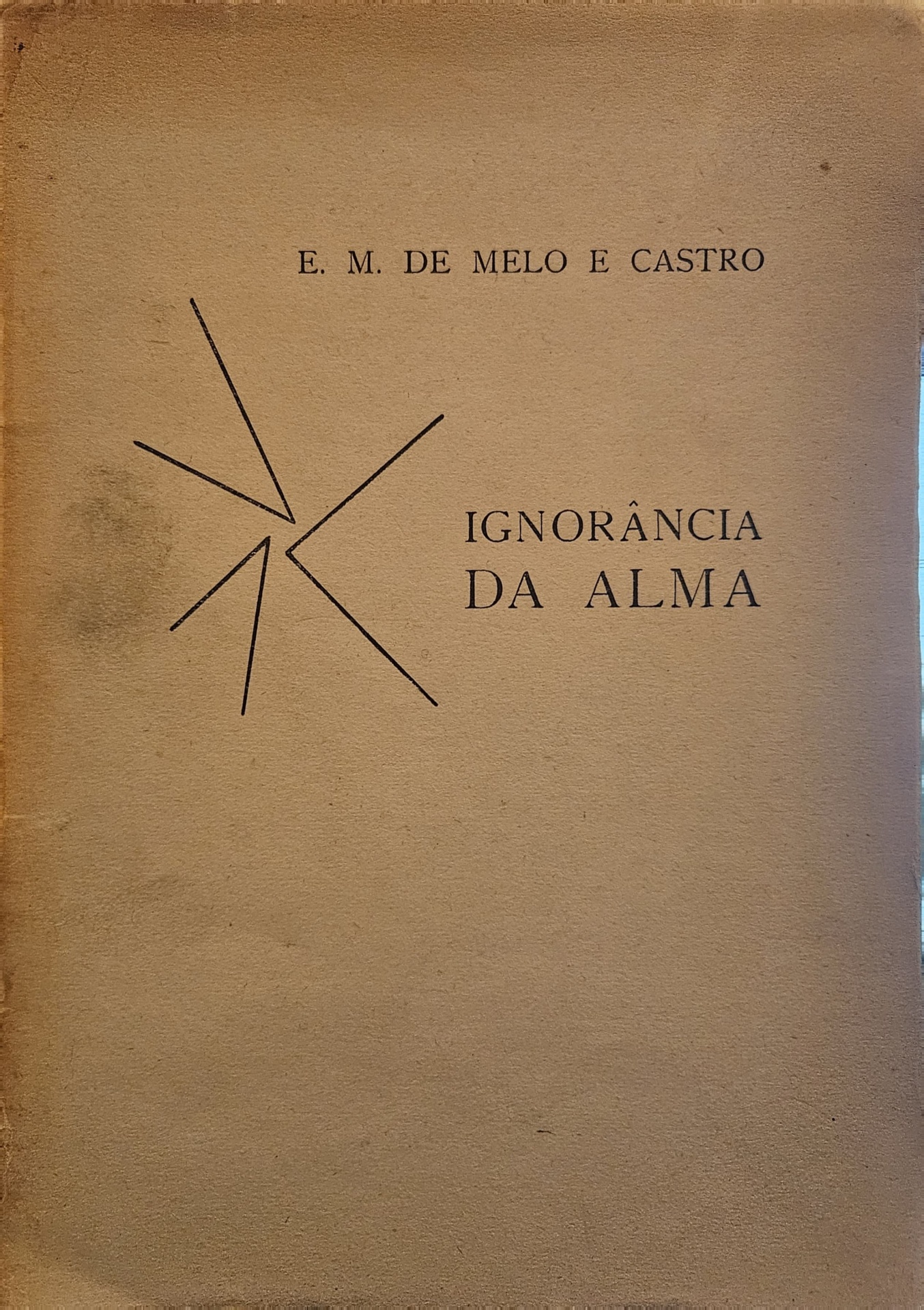 Ignorância da Alma 90,00 € Desconto de %. IVA incluído. Partilhar Comprar Contactar Ignorância da Almade E.M. de Melo e Castro100 pp.Edição de autor, Outubro de 1956Tiragem de 300 exemplares, dos quais 20 fora do mercadoAssinado e numerado pelo autor. Exemplar nº 17.Livro muito raro, um dos primeiros livros do autor.Em muito bom estado - problema na sobrecapa, na parte da lombada. Tags montra de rarosalfarrábio Características