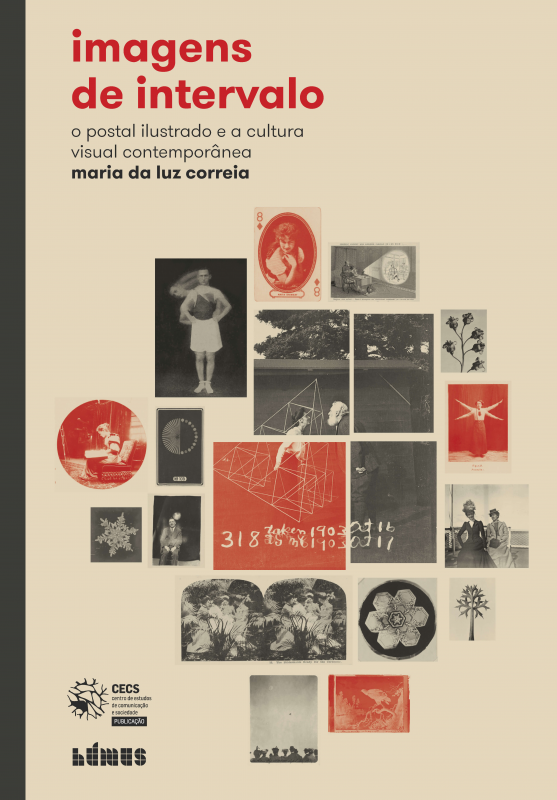 • Cartaz do livro 'Imagens de intervalo' com colagem de imagens e texto em vermelho e preto