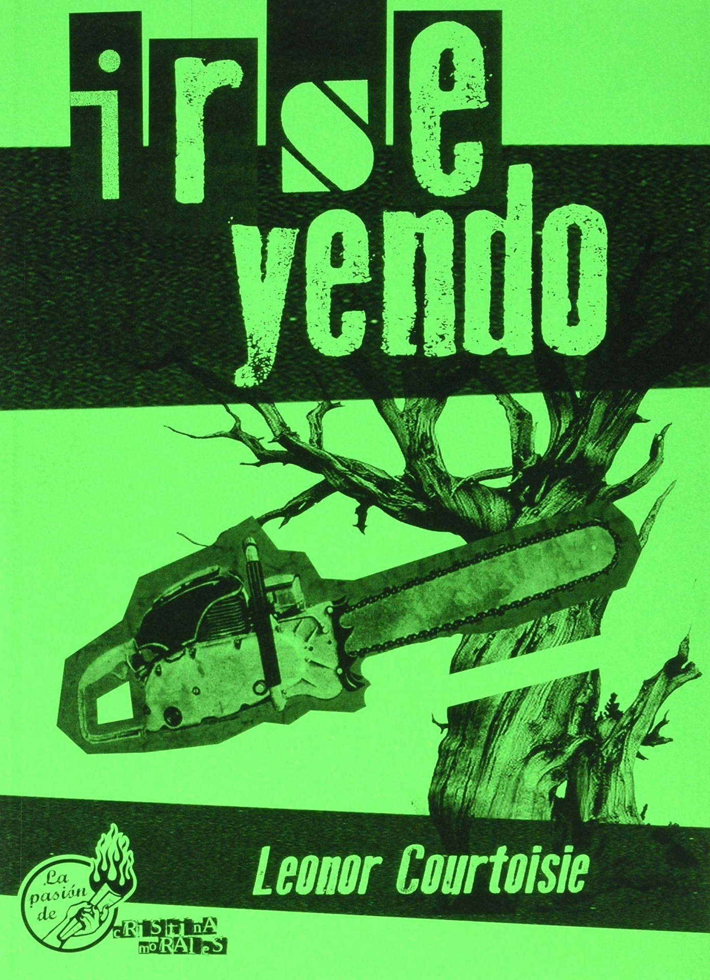 • Capa de livro verde e preto com motosserra e texto irse yendo, Leonor Courtoisie