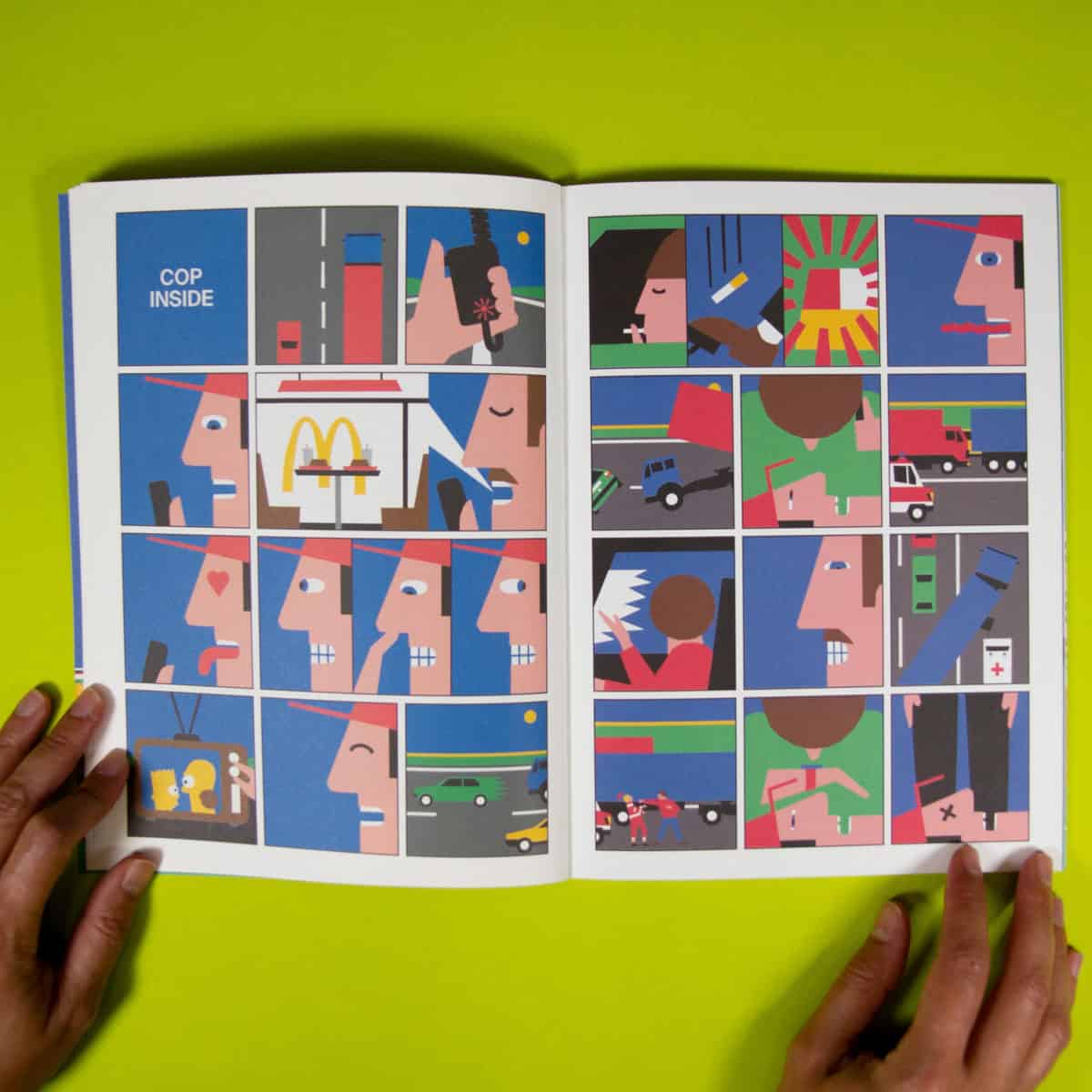 • Livro aberto com ilustrações gráficas coloridas e texto 'COP INSIDE' numa superfície amarela.
