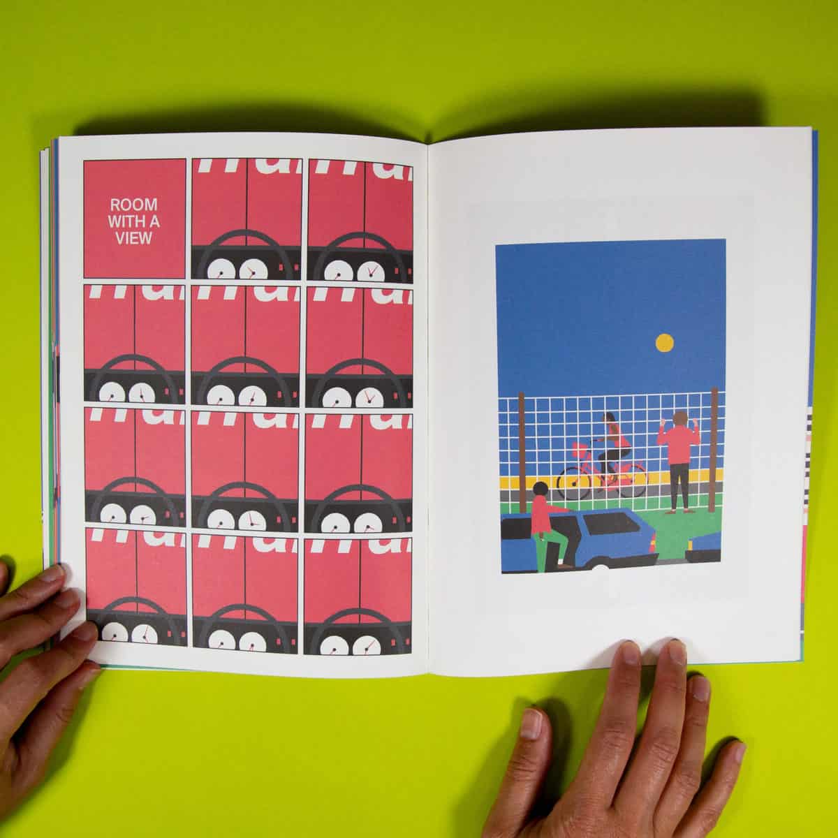 "Jamming“ is an imaginary trip to the motorways of 90s Europe. The book draws inspiration from several journeys to the south – sitting in the back seat – while being stuck. The pictured stories take place between stopped cars on the lane, on side stripes, or at rest stops.