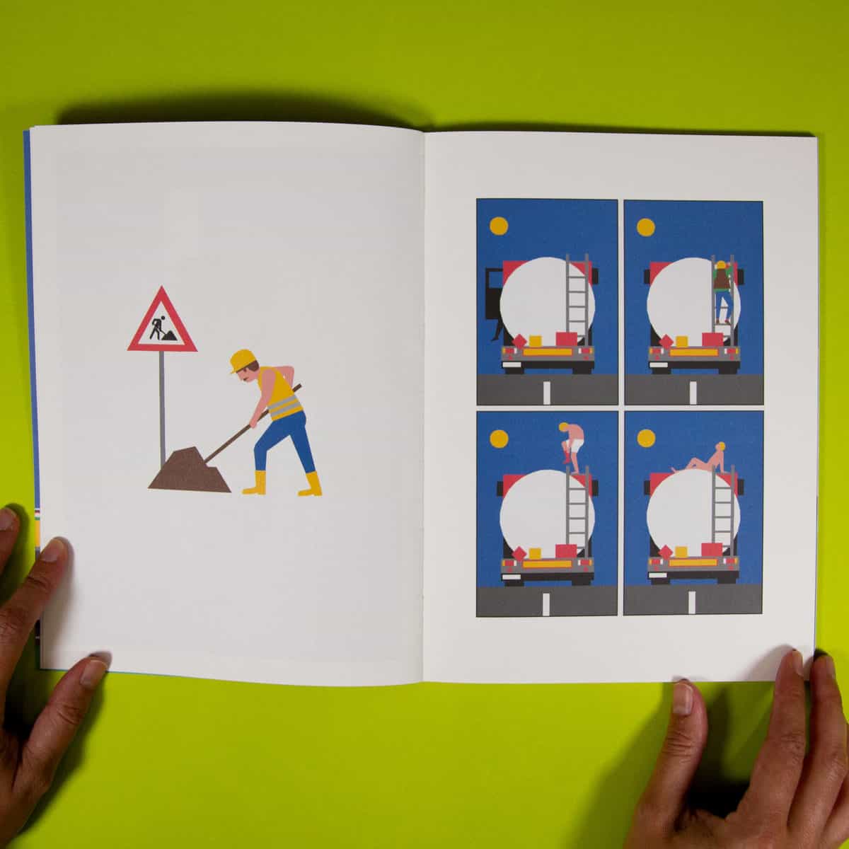 • Livro com ilustrações de trabalhador da construção e caminhão tanque em fundo branco