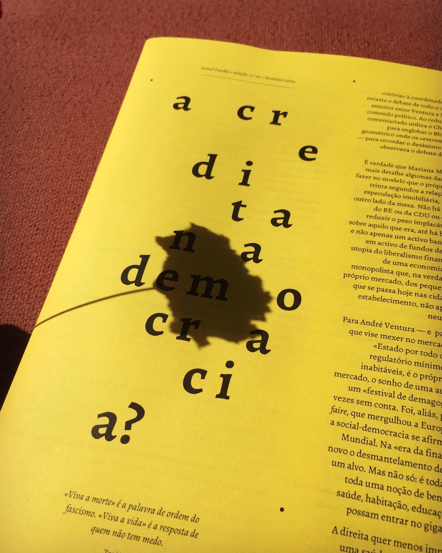 Jornal Punkto – Acredita na democracia? 3,00 € Desconto de %. IVA incluído. Partilhar Comprar Contactar Jornal Punkto edição 3 / 41 • Inverno 2024 • Acredita na democracia? • artigos de Pedro Levi Bismarck, Paulo Ávila, Luhuna Carvalho, Jacques Rancière, Toni Negri e Samera Esmeir Tags jornal punkto2024pedro levi bismarckpaulo ávilaluhuna carvalhojacques rancièretoni negrisamera esmeir