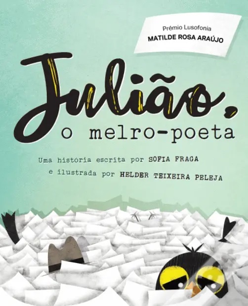 • Capa de livro Julião, o melro-poeta com ilustração de um melro e autocolante de prémio