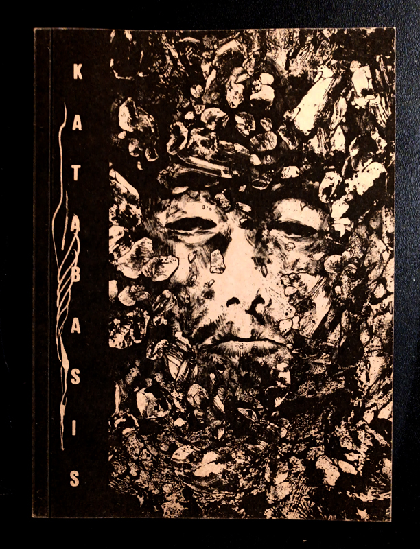 Capa de livro com rosto feminino em padrões de pedra e o título 'KATABASIS' na vertical