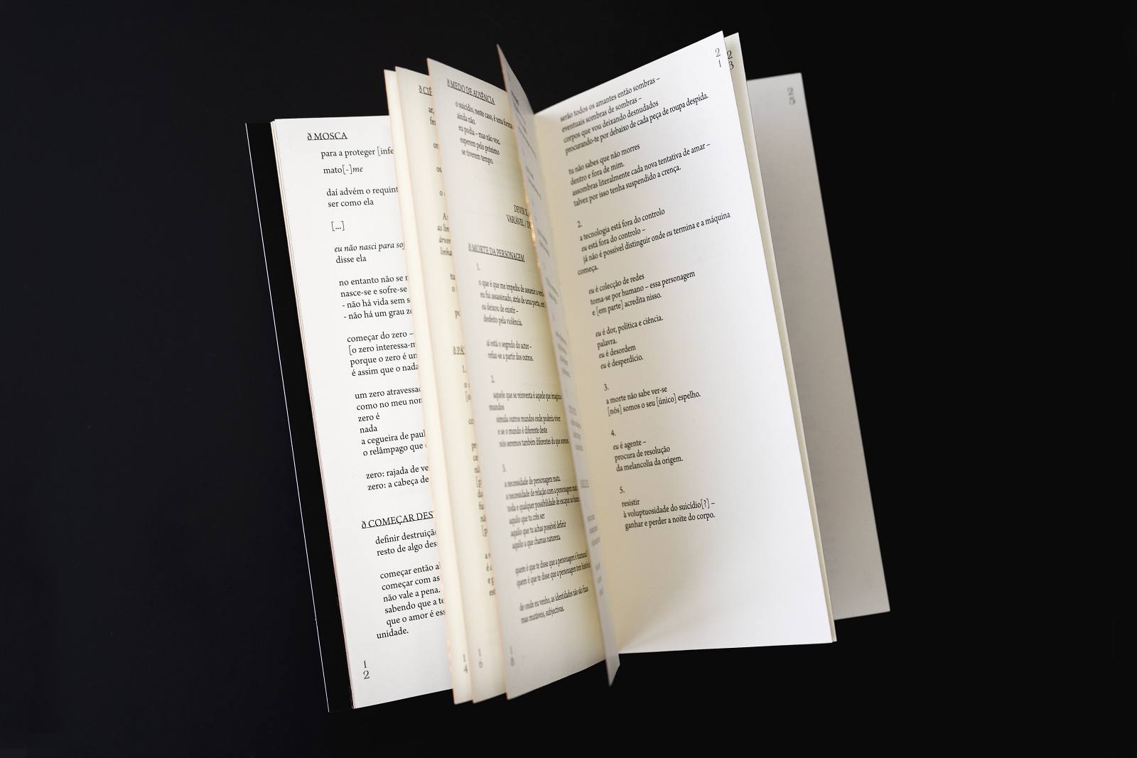 • Livro aberto com páginas brancas e texto preto sobre fundo preto.