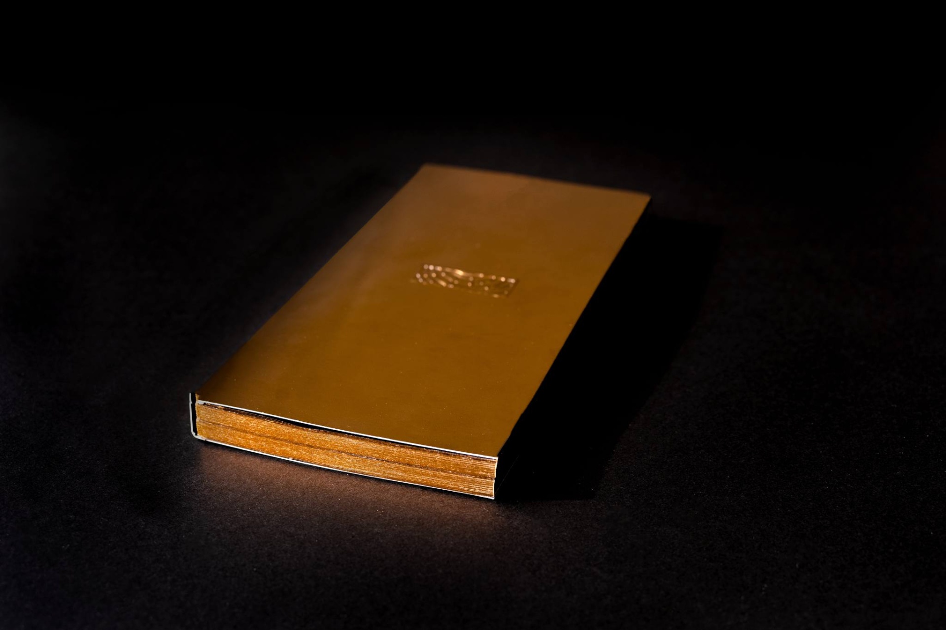 • Livro de capa rígida castanho alaranjado com título em relevo sobre fundo preto