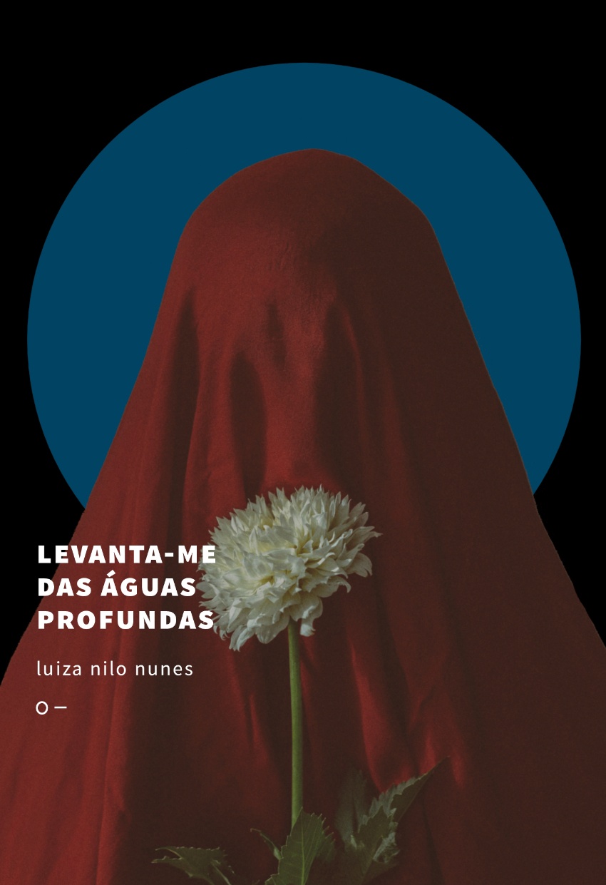 • Pessoa coberta por capa vermelha com flor branca e texto em fundo preto e círculo azul.