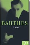 Capa de livro com texto BARTHES Lição e figura humana desfocada em preto e branco