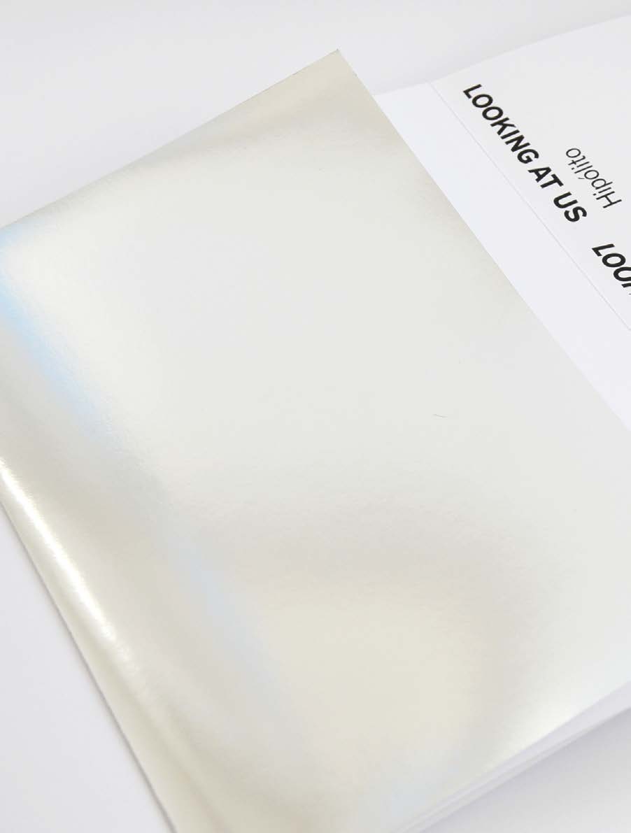 • Livro com capa branca brilhante e texto 'LOOKING AT US Hipólito' numa página