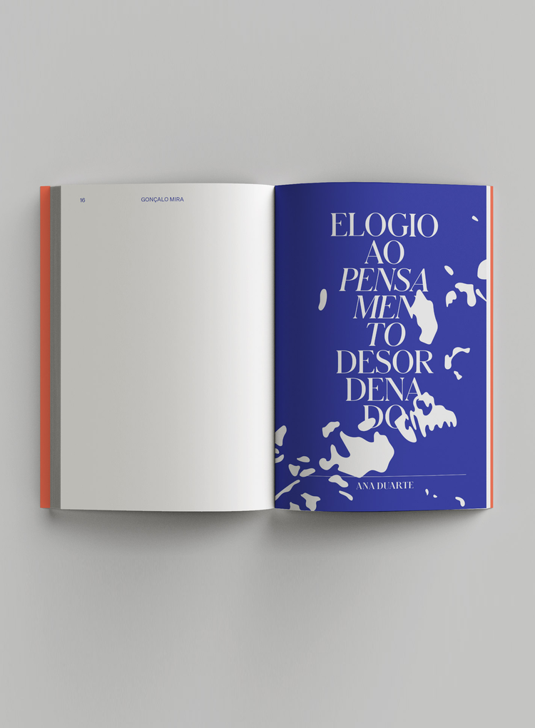 • Livro aberto com página azul e texto branco 'ELOGIO AO PENSAMENTO DESORDENADO'