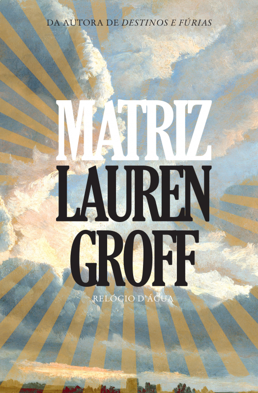 • Capa de livro com título MATRIZ sobre céu com nuvens e raios solares em azul, branco e dourado