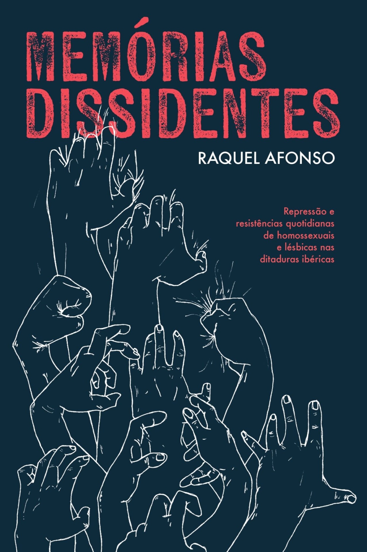 Capa de livro 'Memórias Dissidentes' com desenhos de várias mãos levantadas em fundo azul escuro.