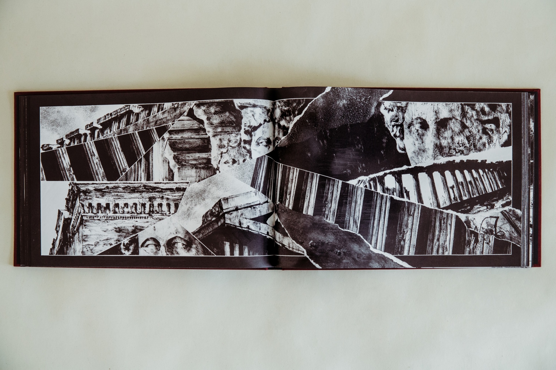 • Livro aberto exibindo imagem artística em preto e branco com arquitetura e padrões listrados