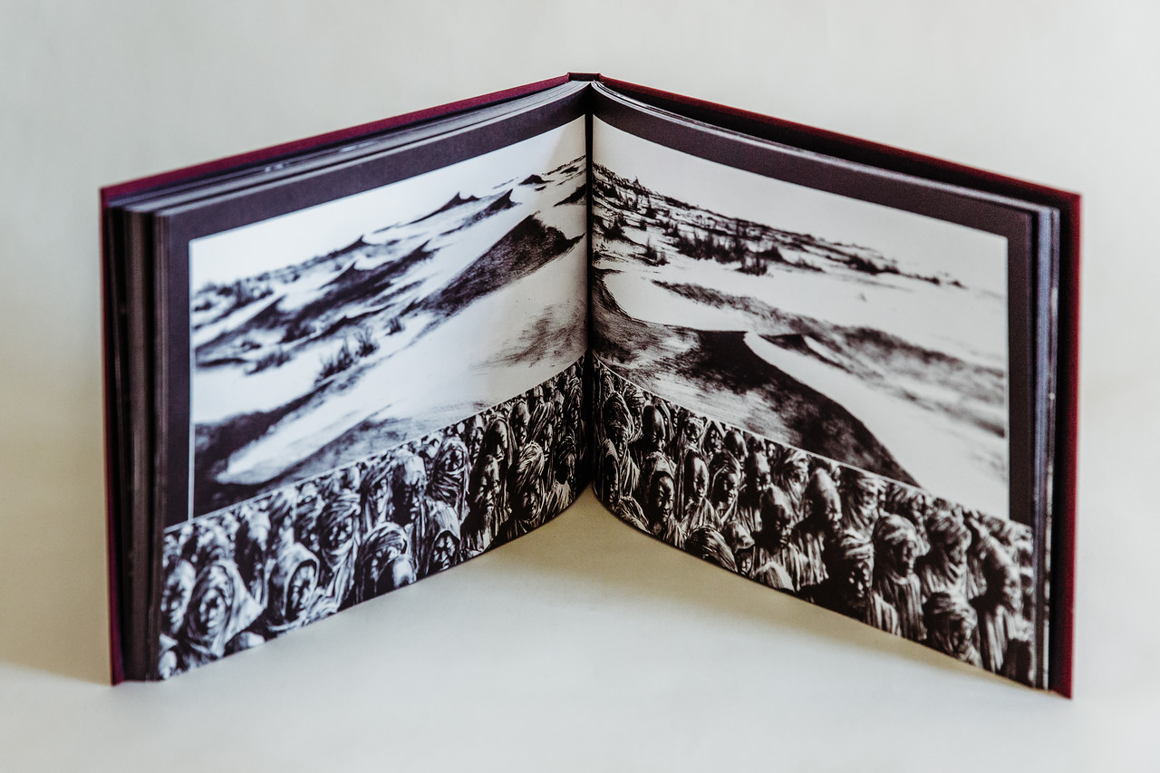 • Livro aberto com imagens em preto e branco de montanhas e pessoas