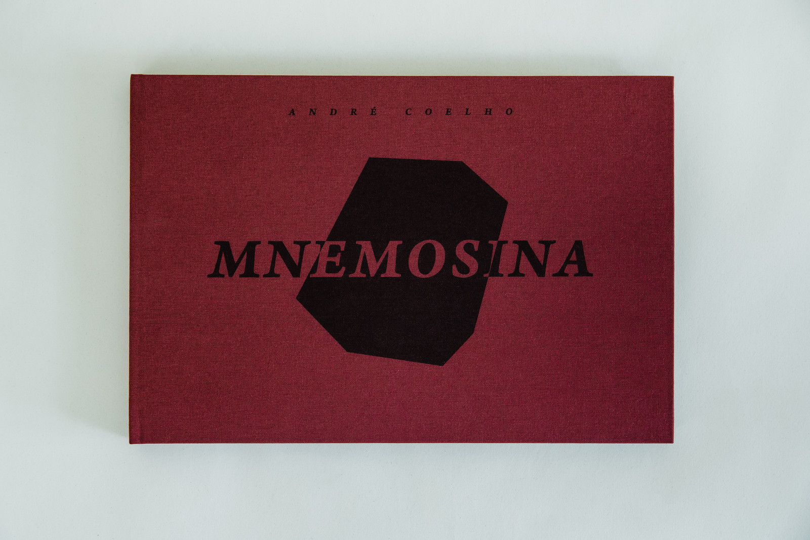 • Livro com capa vinho e título MNÉMOSINA em preto sobre fundo branco