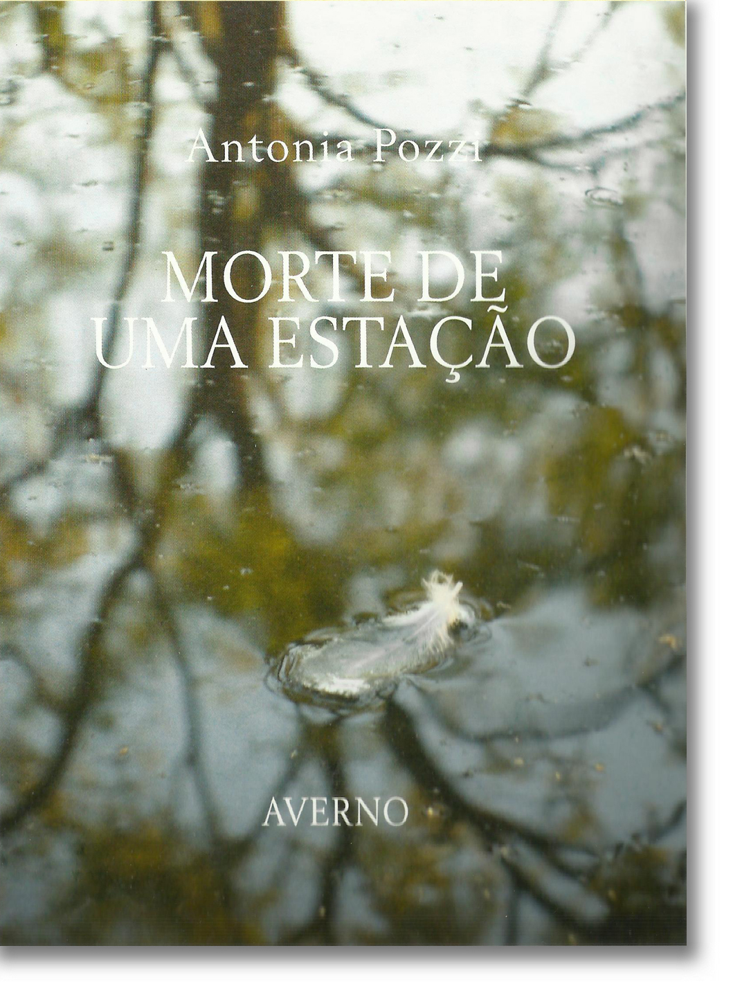 • Capa do livro 'MORTE DE UMA ESTAÇÃO' com imagem de pena branca na água e reflexos de árvores
