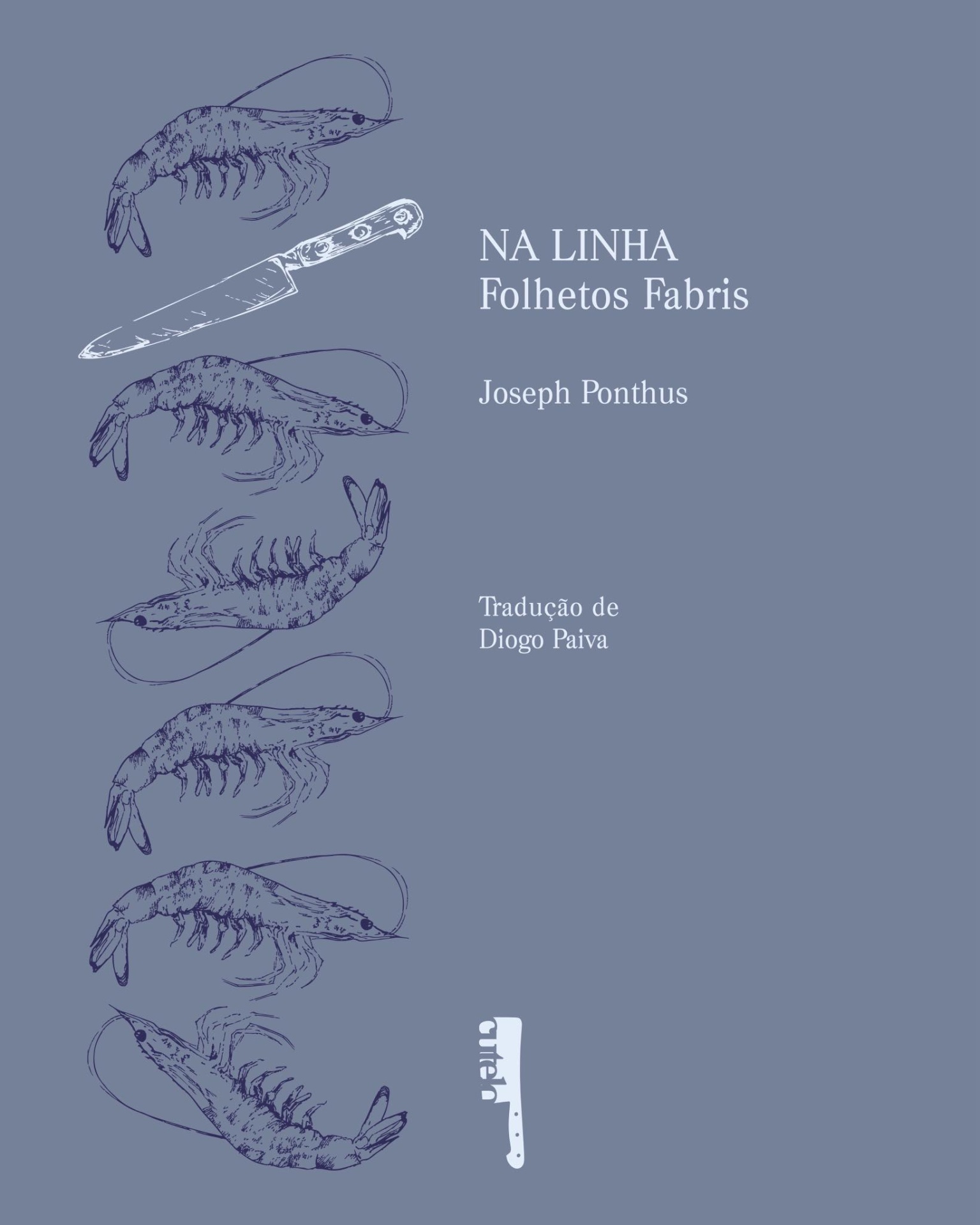 Capa de livro azul com camarões desenhados e texto branco