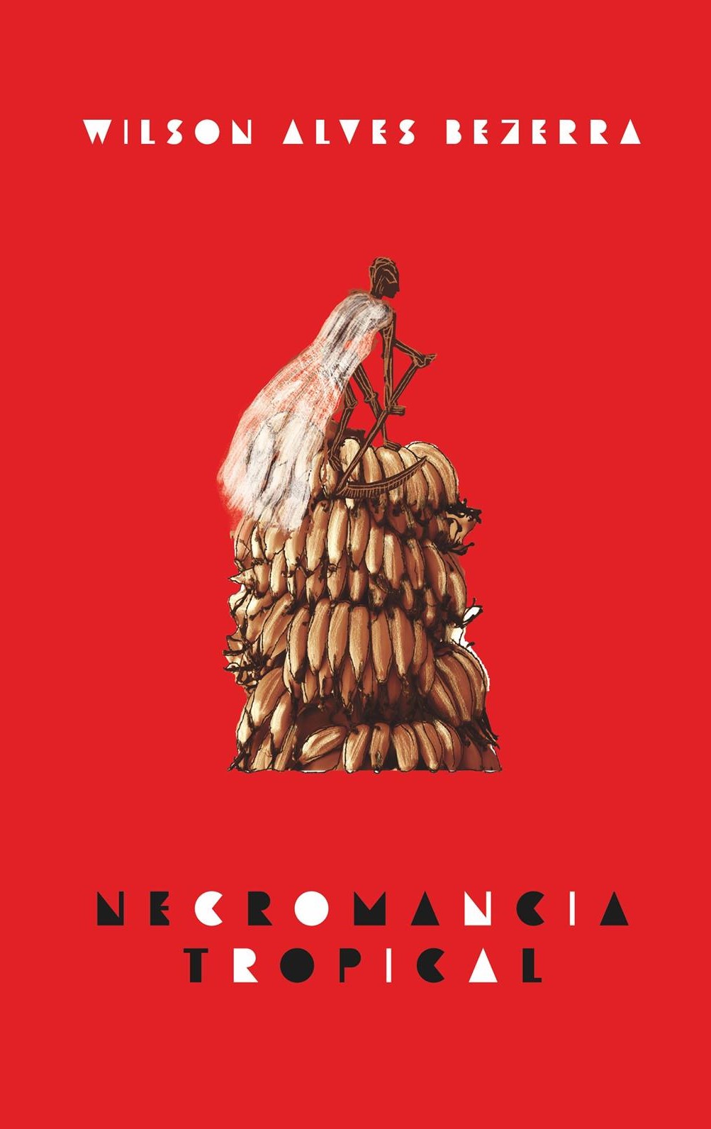 Capa de álbum vermelho com texto WILSON ALVES BEZERRA, NECROMANCIA TROPICAL e ilustração de figura humana e bananas.