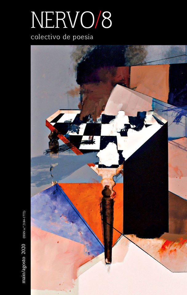 • Capa de livro com arte abstrata em preto, branco, laranja e azul e texto NERVO/8 coletivo de poesia