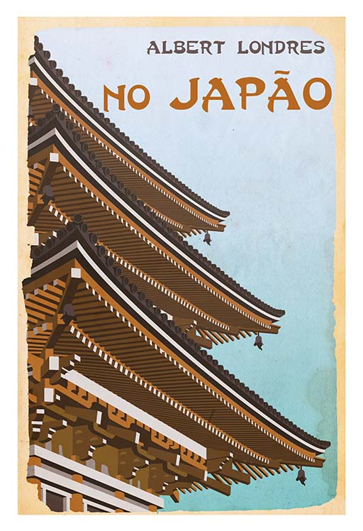 Capa de livro com ilustração de edifício japonês tradicional e texto em castanho