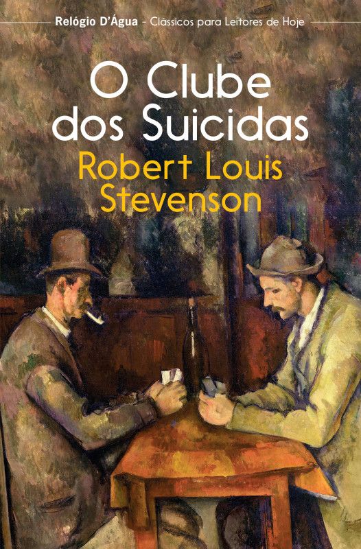 • Capa de livro 'O Clube dos Suicidas' mostrando dois homens com chapéus a jogar cartas numa mesa de madeira.