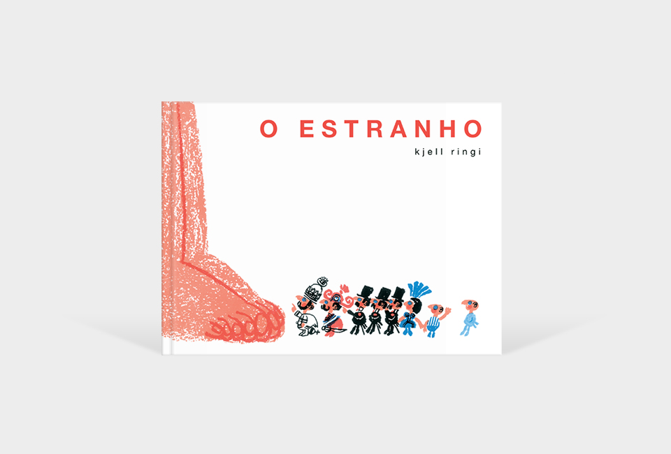 • Capa do livro 'O ESTRANHO' com ilustração de pé vermelho e pequenas figuras coloridas