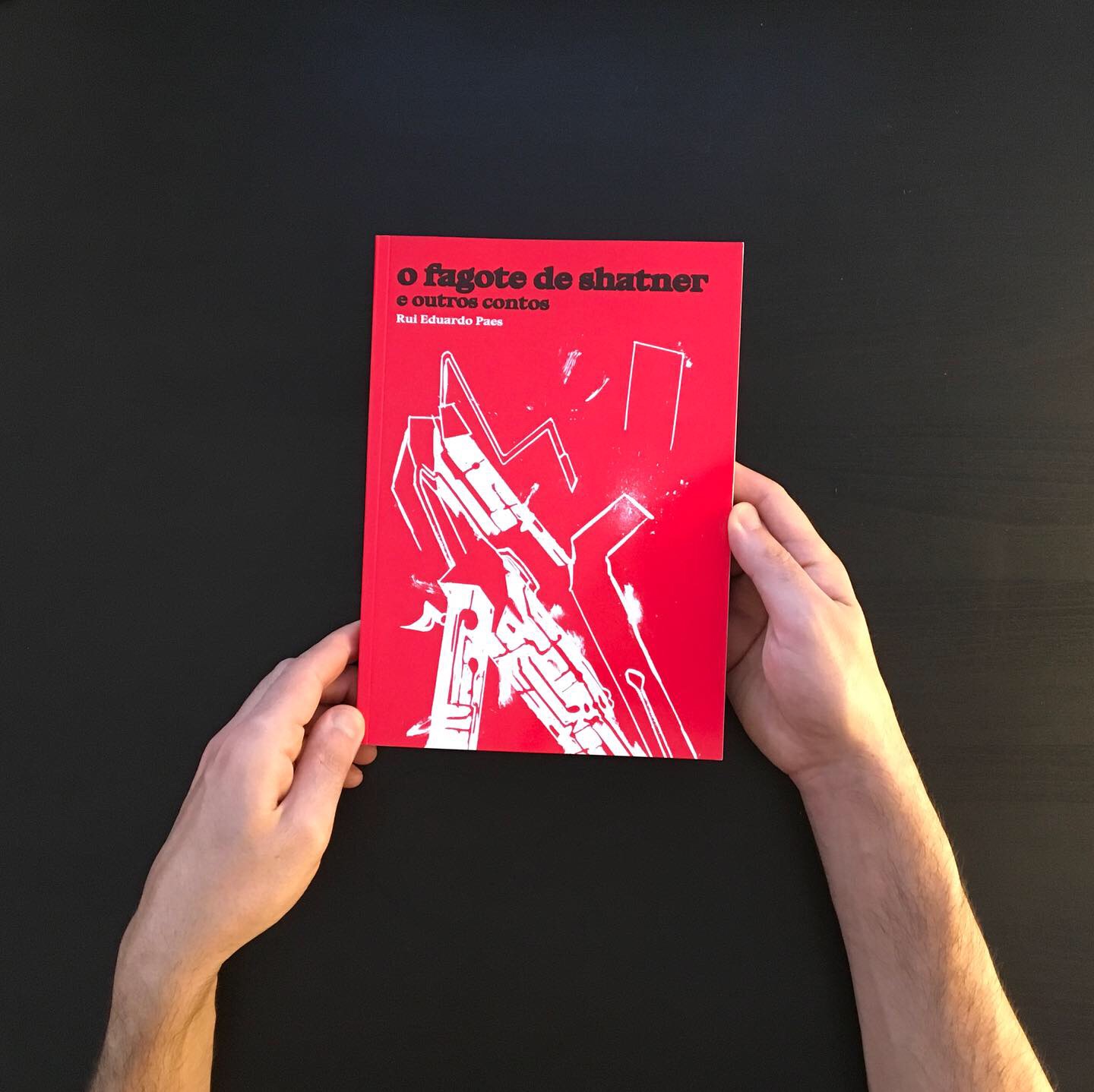 • Livro vermelho com título em preto e vermelho e ilustração branca, duas mãos seguram o livro sobre superfície preta