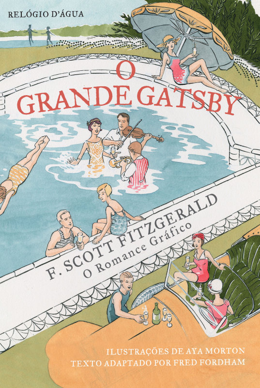 Capa ilustrada de livro O Grande Gatsby com piscina, pessoas e automóvel clássico amarelo