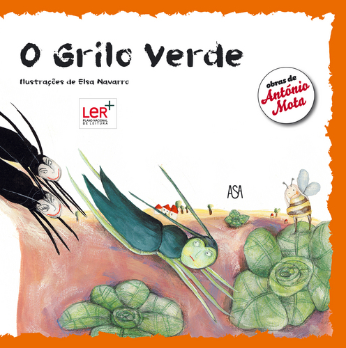 • Capa do livro 'O Grilo Verde' com ilustração de grilo verde e insetos em fundo branco e borda laranja