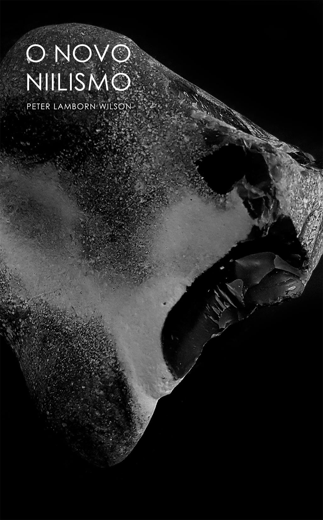 • Capa de livro com escultura fragmentada de rosto e texto branco sobre fundo preto.
