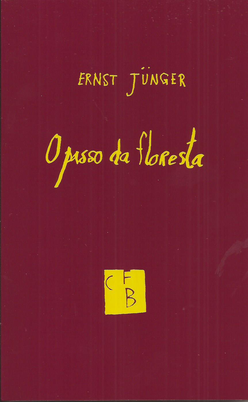 • Livro com capa vinho e texto amarelo 'ERNST JÜNGER O passo da floresta' e logo CTB