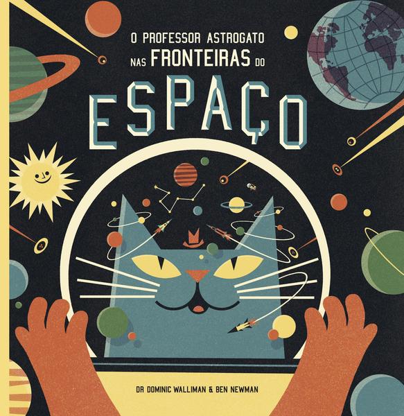 Capa de livro com gato astronauta e planetas no espaço com título em português.