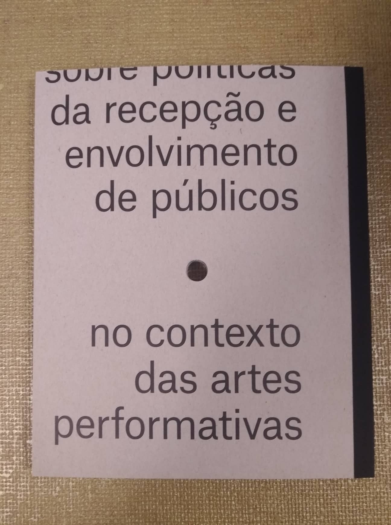 • Etiqueta branca com texto em português sobre artes performativas sobre fundo bege têxtil
