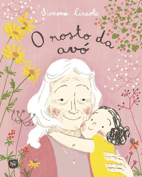 • Capa de livro ilustrada de uma avó com criança, flores amarelas e texto em rosa