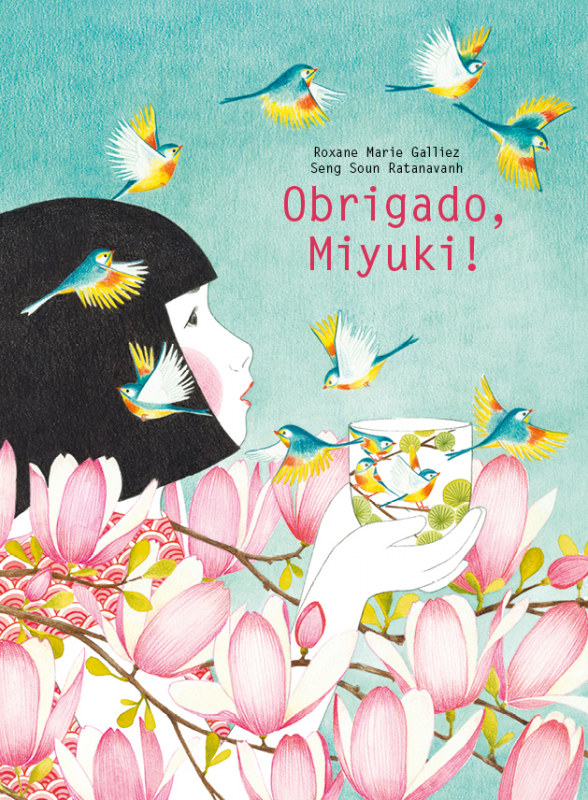 • Capa de livro ilustrada com menina entre flores e pássaros, texto Obrigado, Miyuki!