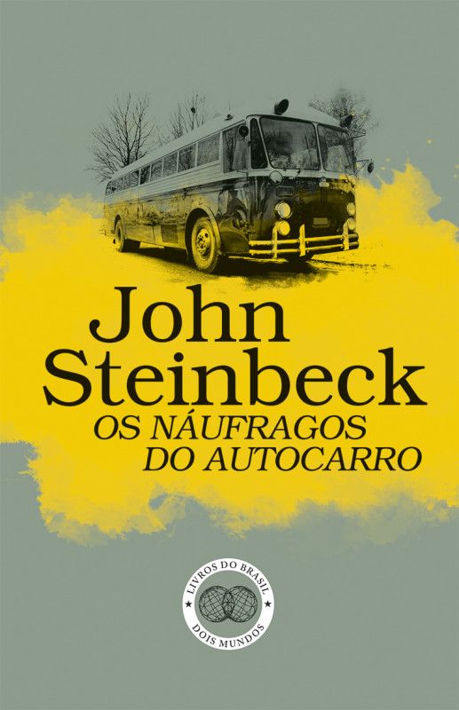 • Capa de livro com autocarro antigo e título de John Steinbeck em amarelo e cinza