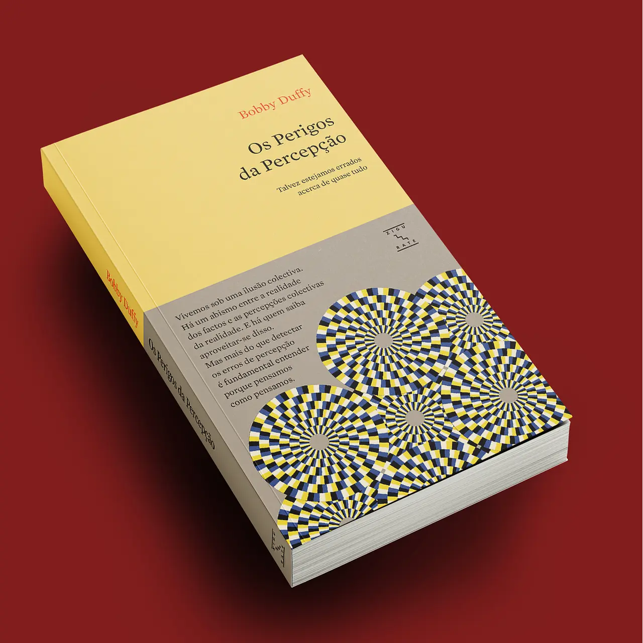 Livro Os Perigos da Percepção com capa amarelo e cinzenta e padrão visual colorido