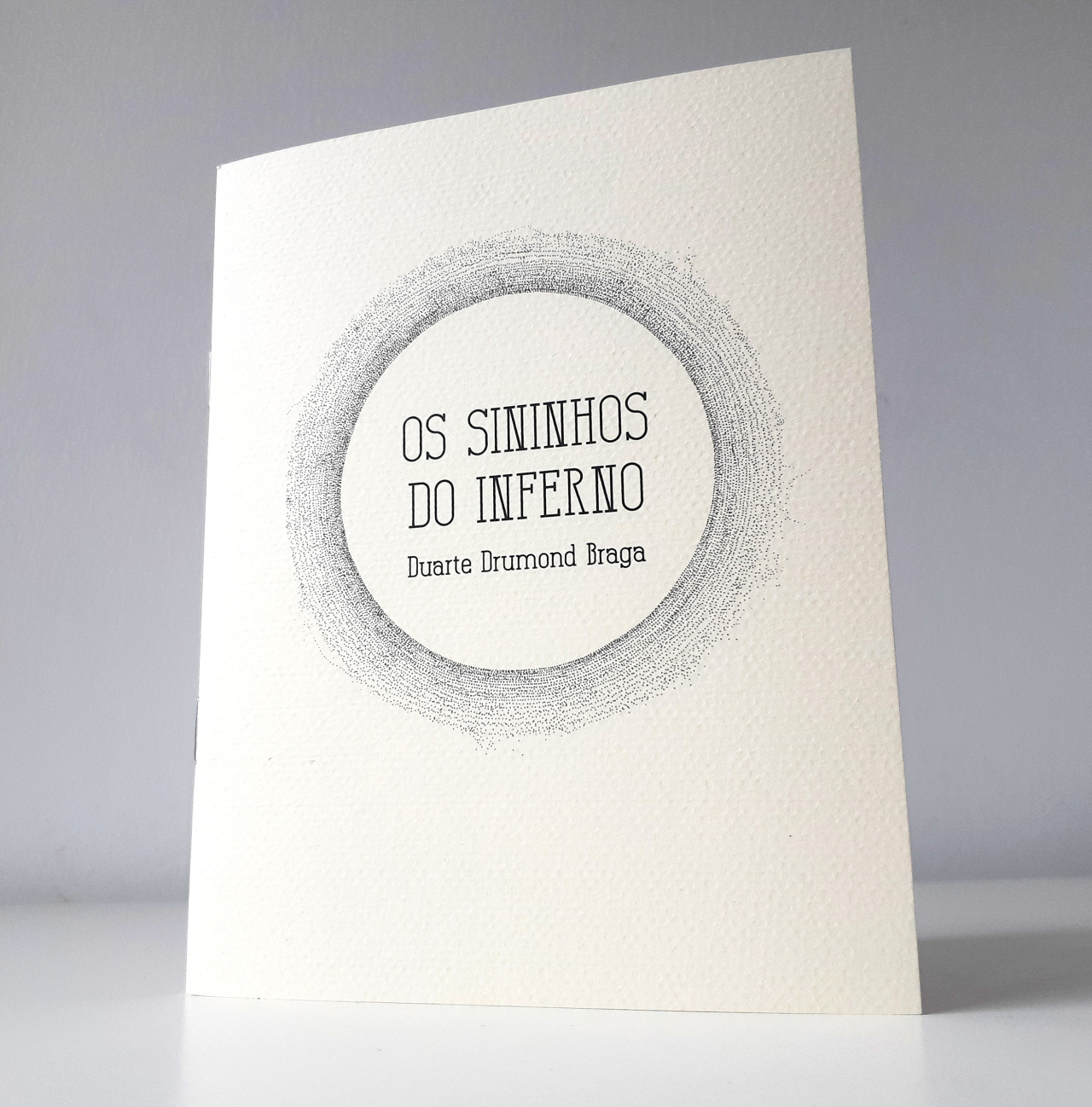 • Livro branco com título e nome do autor dentro de um círculo pontilhado cinzento