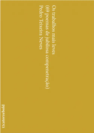 Os Trabalhos Mais Leves 4,44 € Desconto de %. IVA incluído. Partilhar Comprar Contactar Os Trabalhos Mais Leves Pedro Teixeira Neves 86 pp. 114 x 158 x 8 mm Editora Húmus, Fevereiro 2021ISBN: 9789897555947 Tags pedro teixeira nevesPoesiaHúmus Características