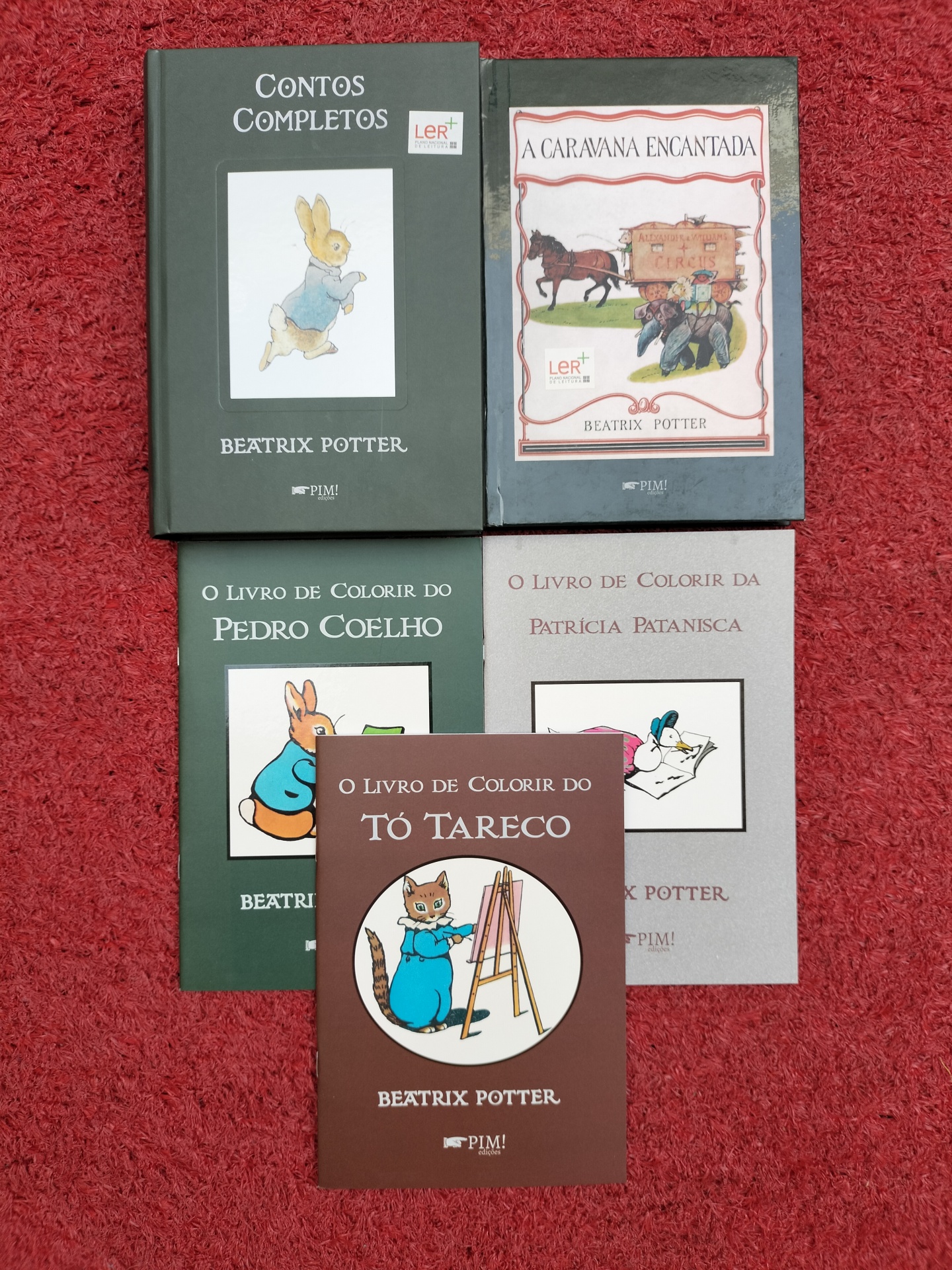Cinco livros de Beatrix Potter sobre carpete vermelha