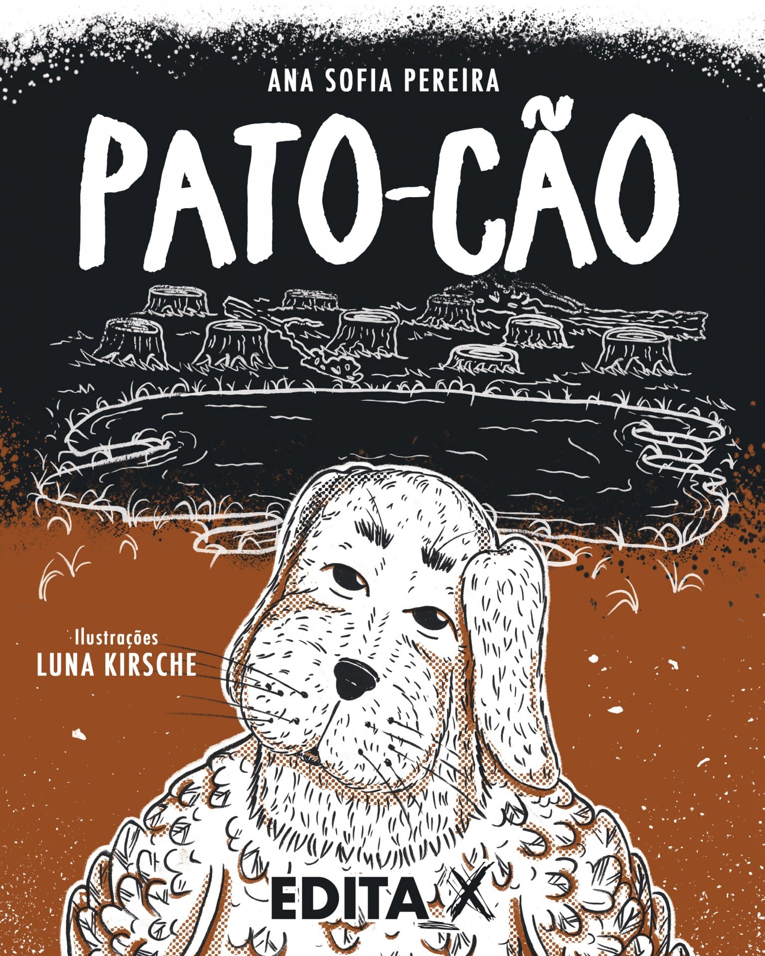 • Capa de livro 'PATO-CÃO' com desenho híbrido de pato e cão sobre fundo preto e castanho