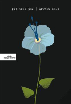 • Capa de livro preta com flor azul clara e texto de título e autor.