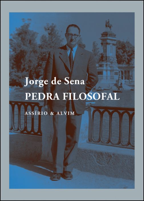 • Capa de livro 'Pedra Filosofal' de Jorge de Sena com imagem de homem perto de grade com estátua ao fundo