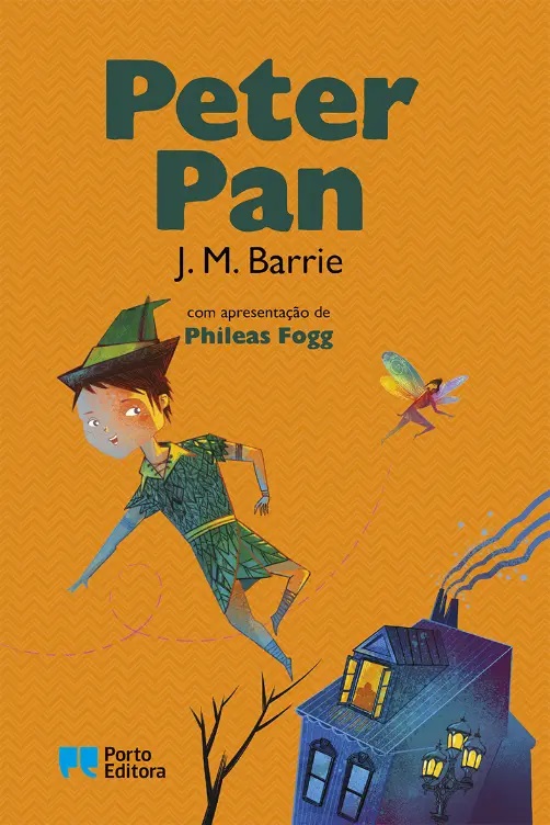 • Capa do livro Peter Pan com ilustração de Peter Pan a voar e casa azul