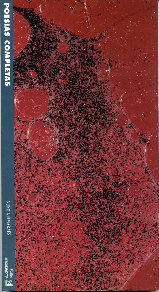 Capa de livro 'POESIAS COMPLETAS' de Nuno Guimarães em fundo vermelho com padrão preto irregular