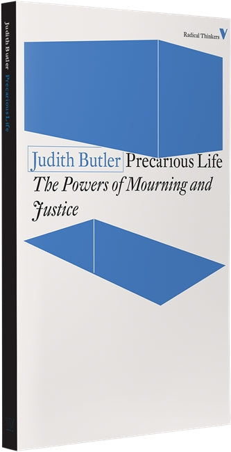 Capa de livro branco com elementos gráficos azuis e título 'Precarious Life' de Judith Butler